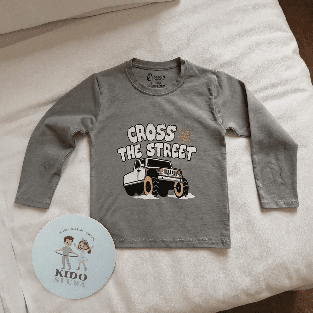Jasnoszara bluzka z długim rękawem to idealny wybór dla małego fana motoryzacji. Z przodu dynamiczny nadruk samochodu i napis „Cross the Street”, który dodaje energii i miejskiego stylu.