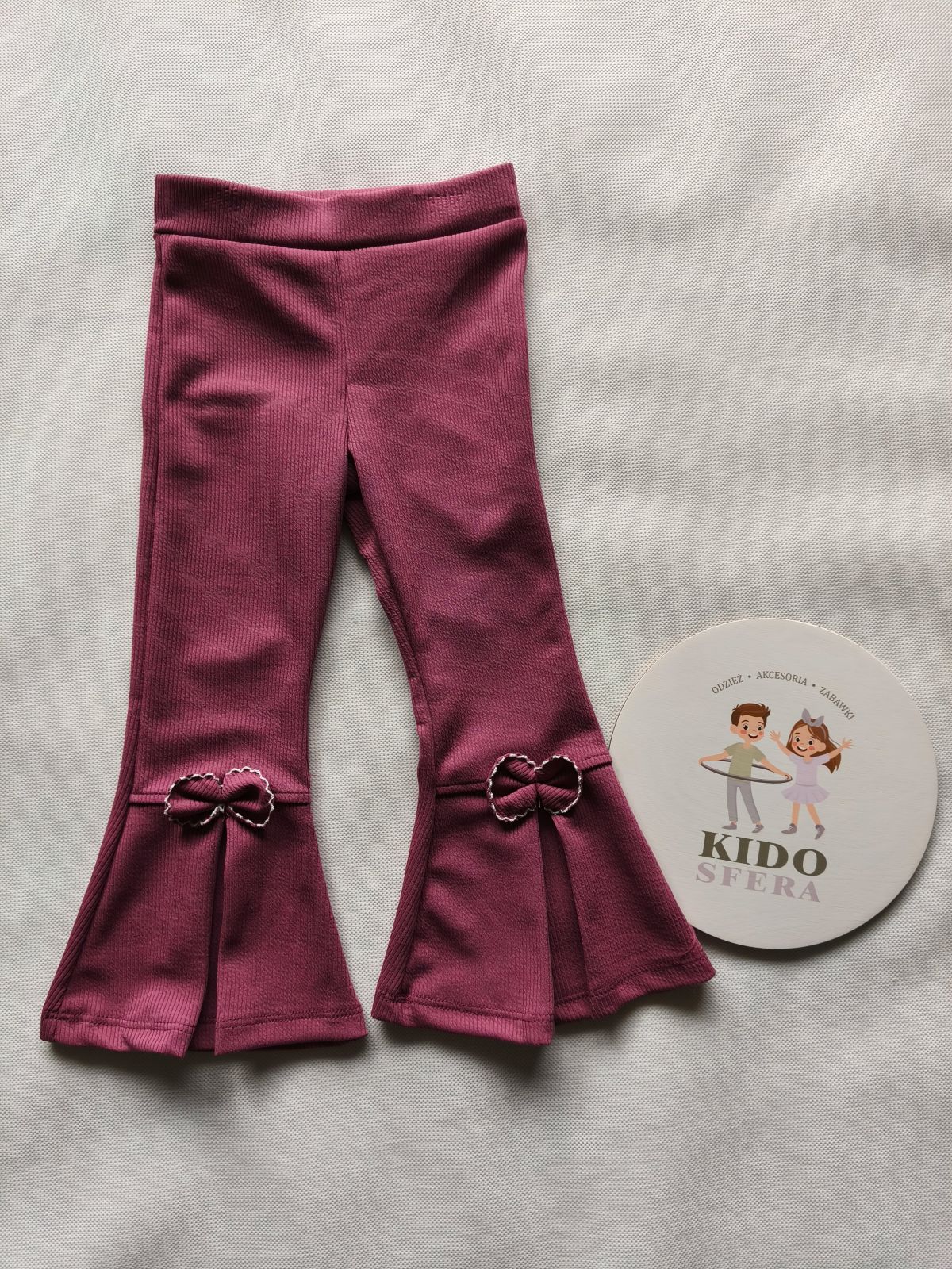Dziewczęce spodnie typu flare z delikatnym rozcięciem po zewnętrznej stronie nogawki, zakończone ozdobną kokardką.🎀