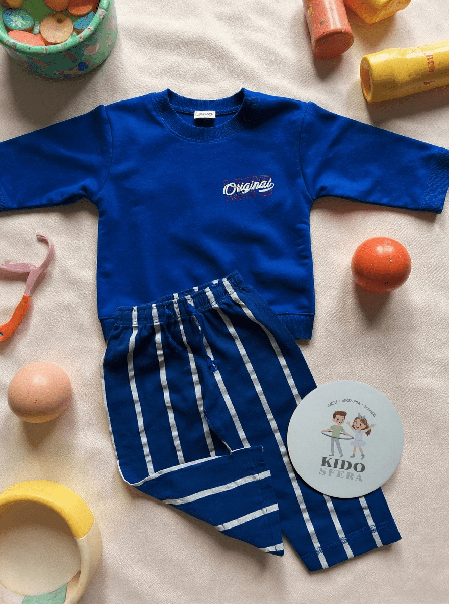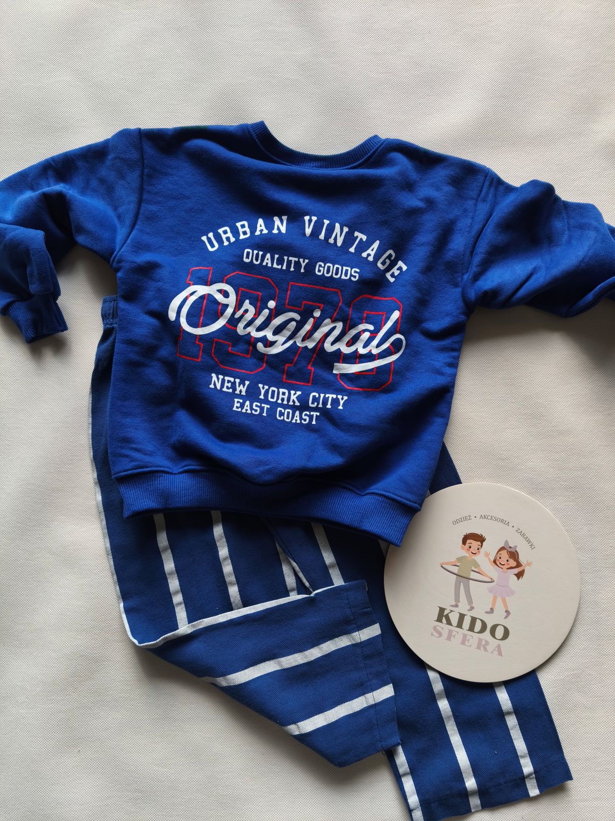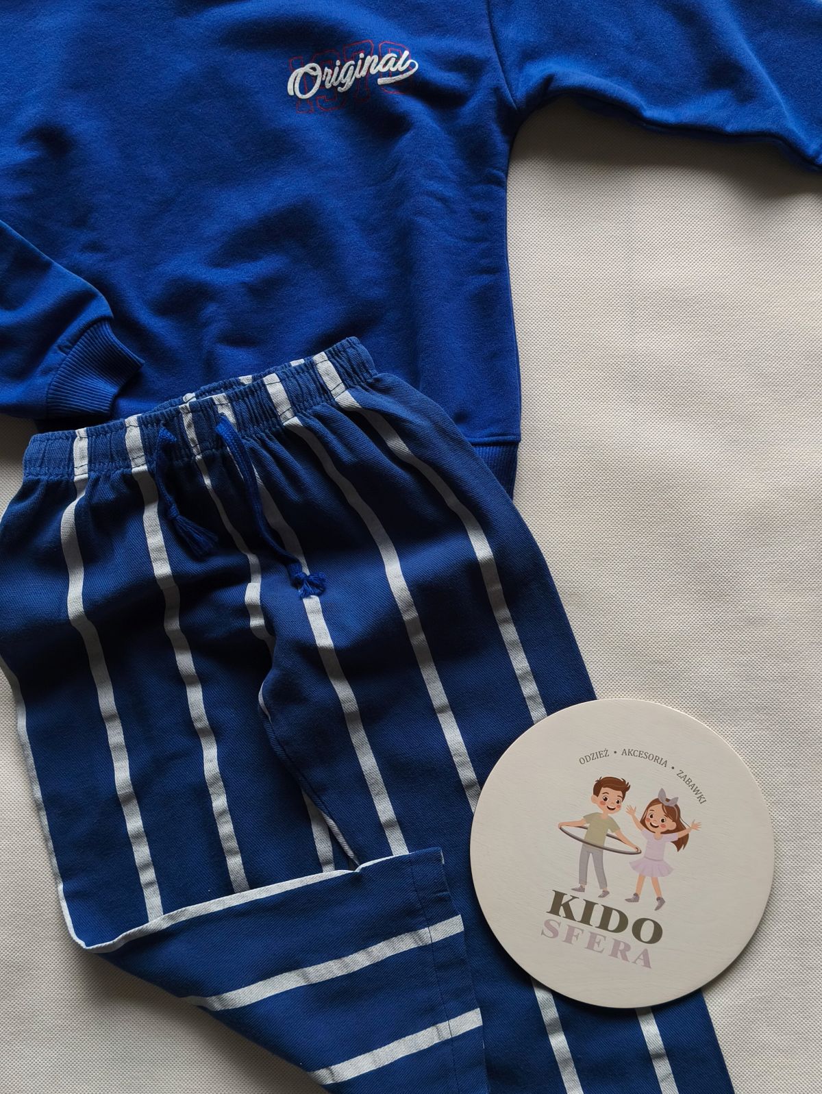 Granatowy komplet dla chłopca: bluza z nadrukiem na plecach + spodnie w pionowe pasy.👖👘🧶