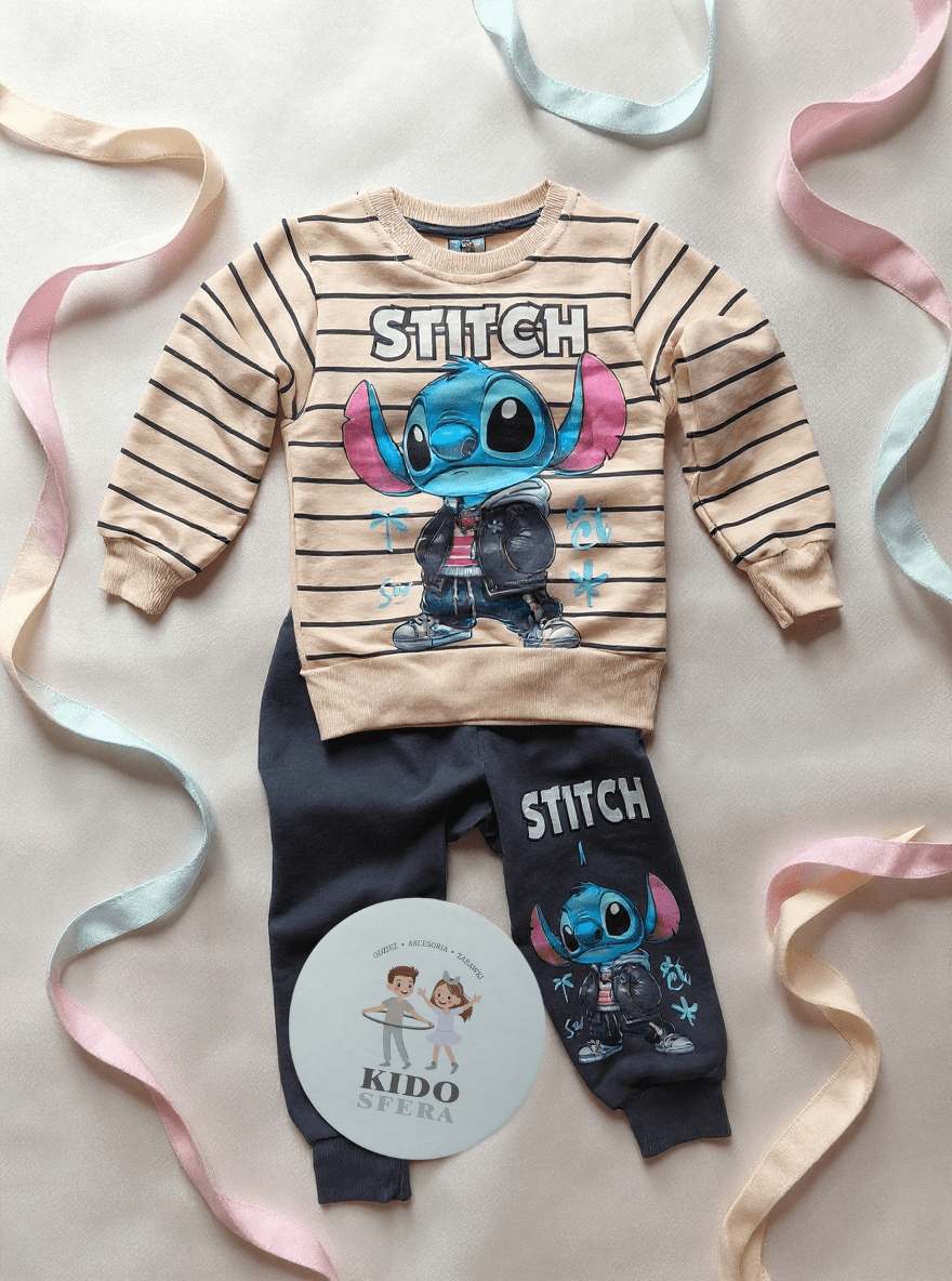 Ten zestaw to idealna propozycja dla małego fana przygód! Beżowa bluza z uroczym nadrukiem Stitcha i grafitowe spodnie tworzą wygodny look z bajkowym twistem.