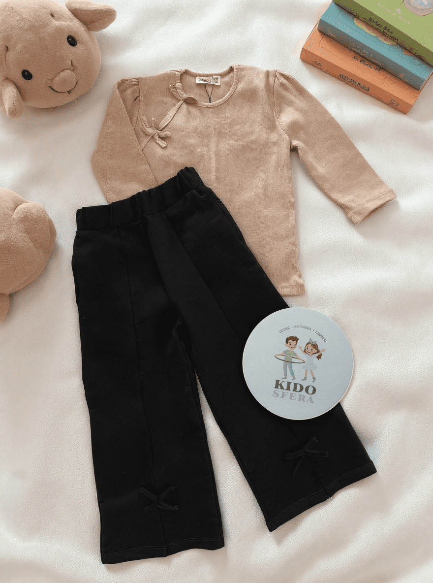 Czarne spodnie z rozszerzanymi nogawkami, rozcięciem i ozdobną kokardką dodają modowego charakteru. Idealny zestaw na wyjątkowe okazje i codzienne stylizacje.