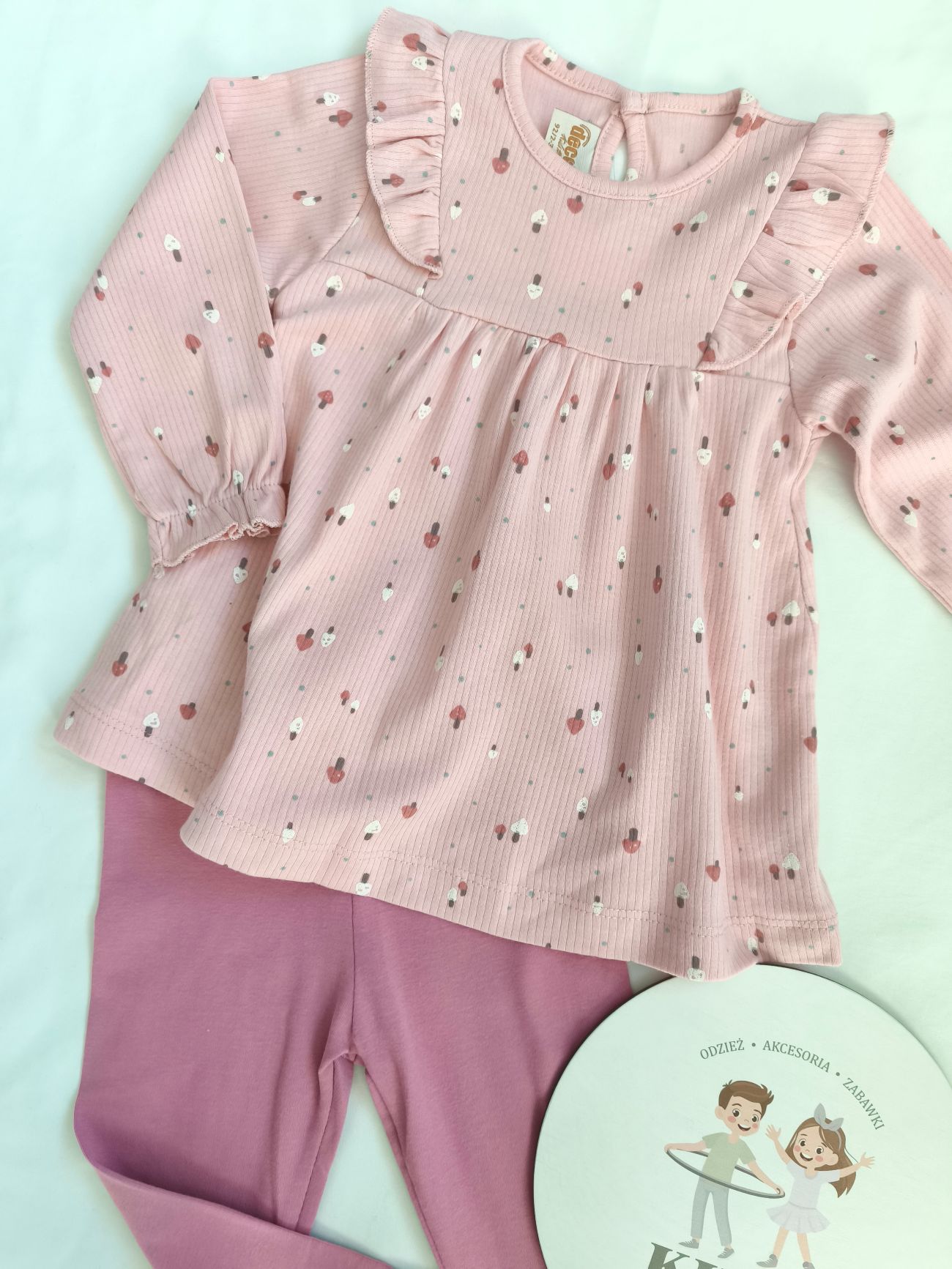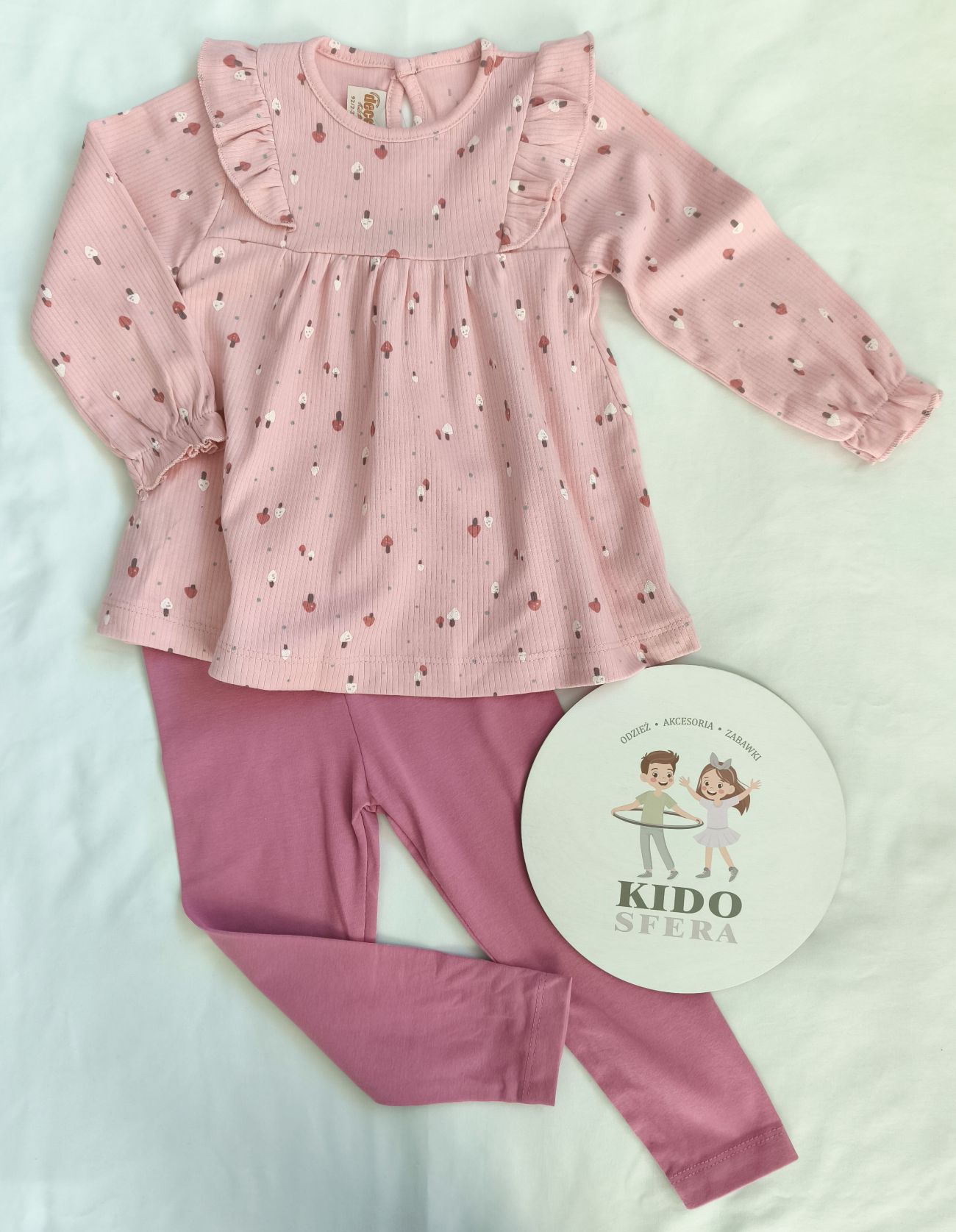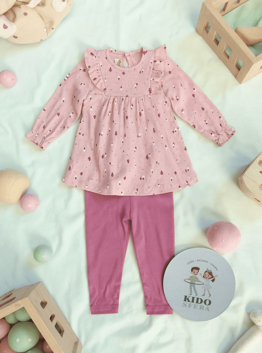 Komplet dla dziewczynki z miękkiej bawełny 100%, w skład którego wchodzi bluzka z falbanką, legginsy oraz opaska z kokardką 🍄