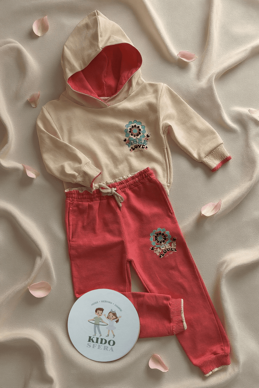 Ten zestaw to połączenie wygody i dziewczęcego stylu. Bluza w kolorze ecru z delikatnym napisem More Love, a różowe spodnie dodają pastelowego wdzięku.