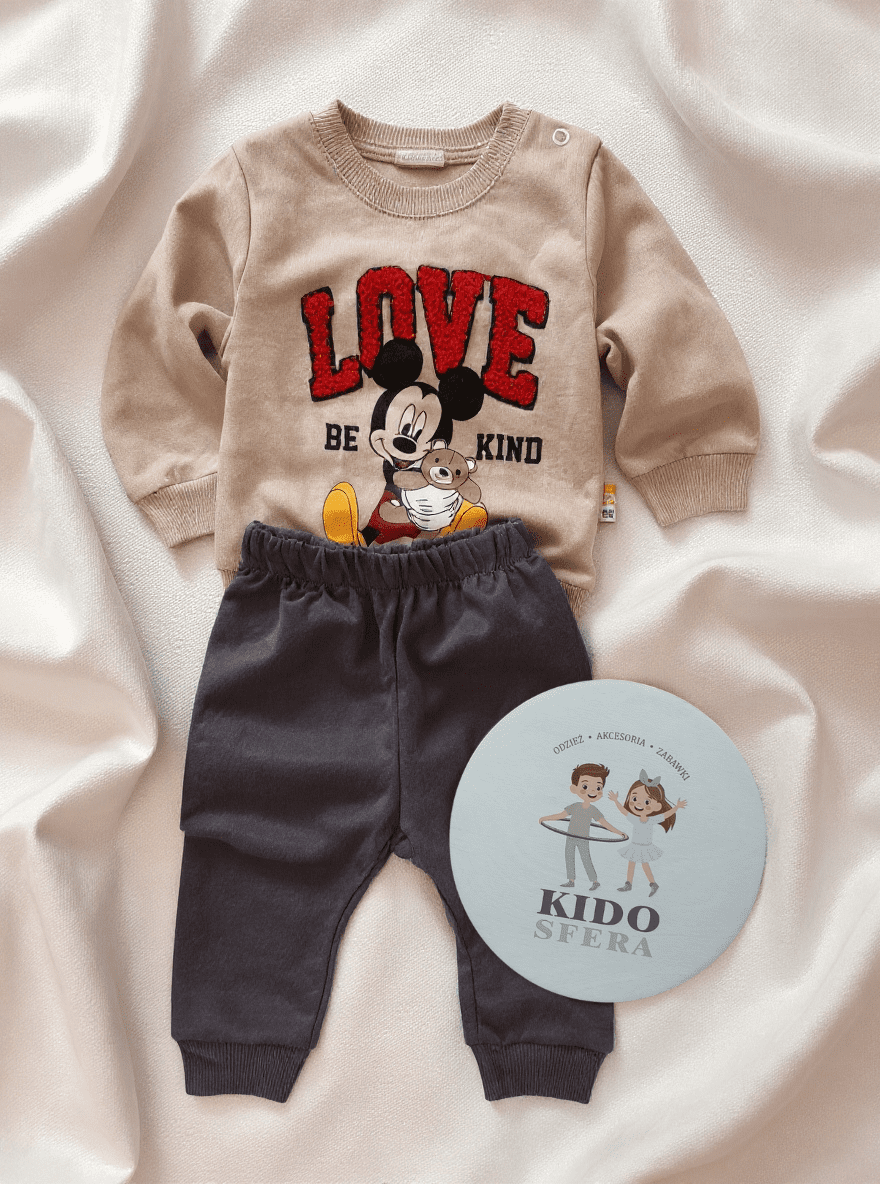Beżowa bluza z motywem Myszki Miki i szare spodnie dresowe.
