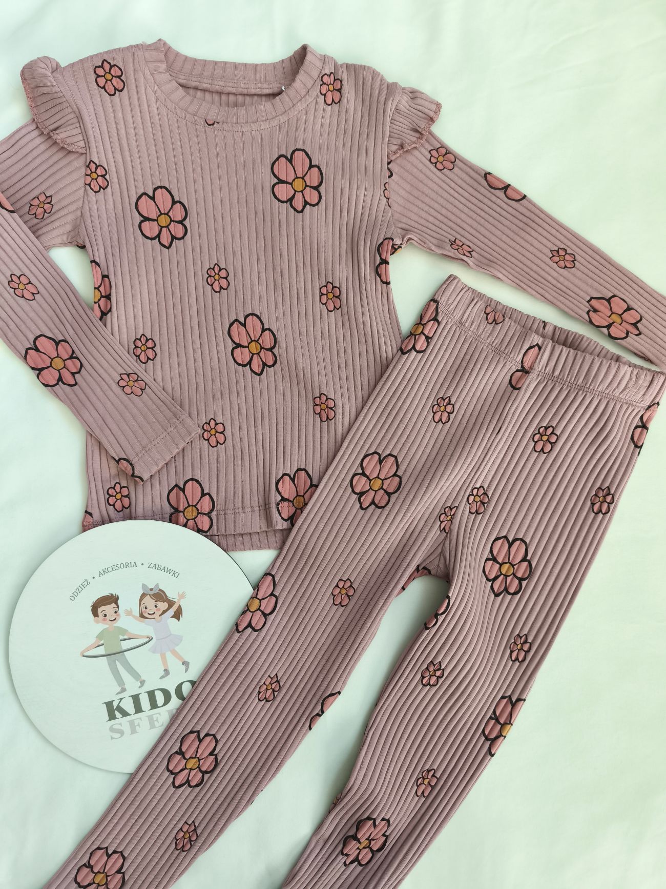 Składa się z wygodnej bluzki i legginsów ozdobionych pięknym kwiatowym motywem, który dodaje uroku