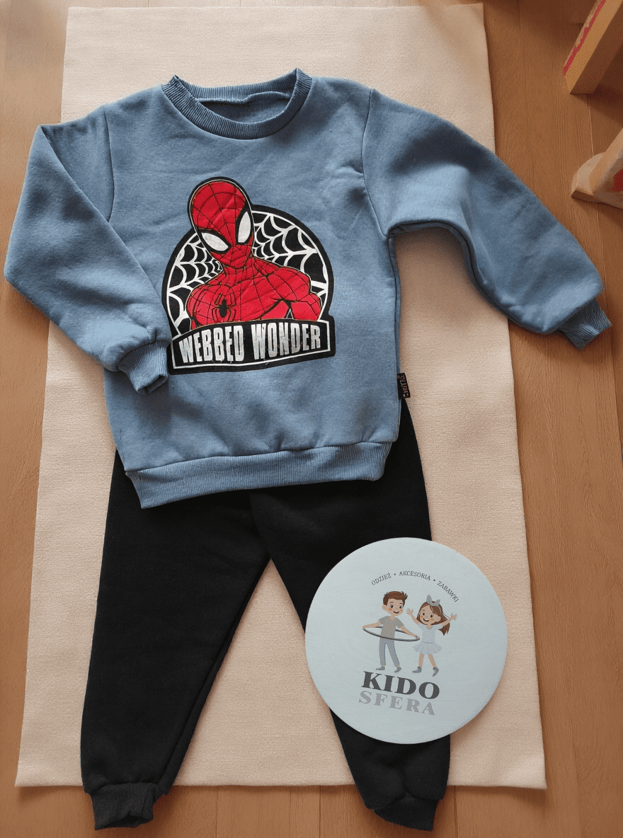Niebieska bluza z motywem Spidermana i czarne spodnie, oba elementy wykonane z ciepłej, 100% bawełny.