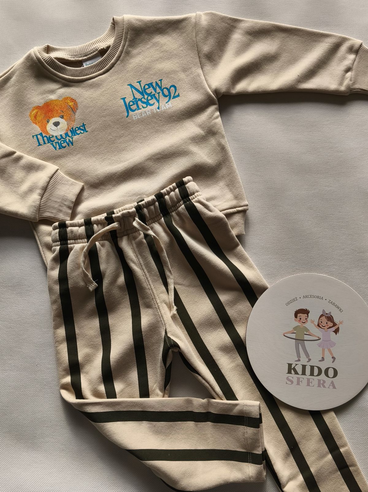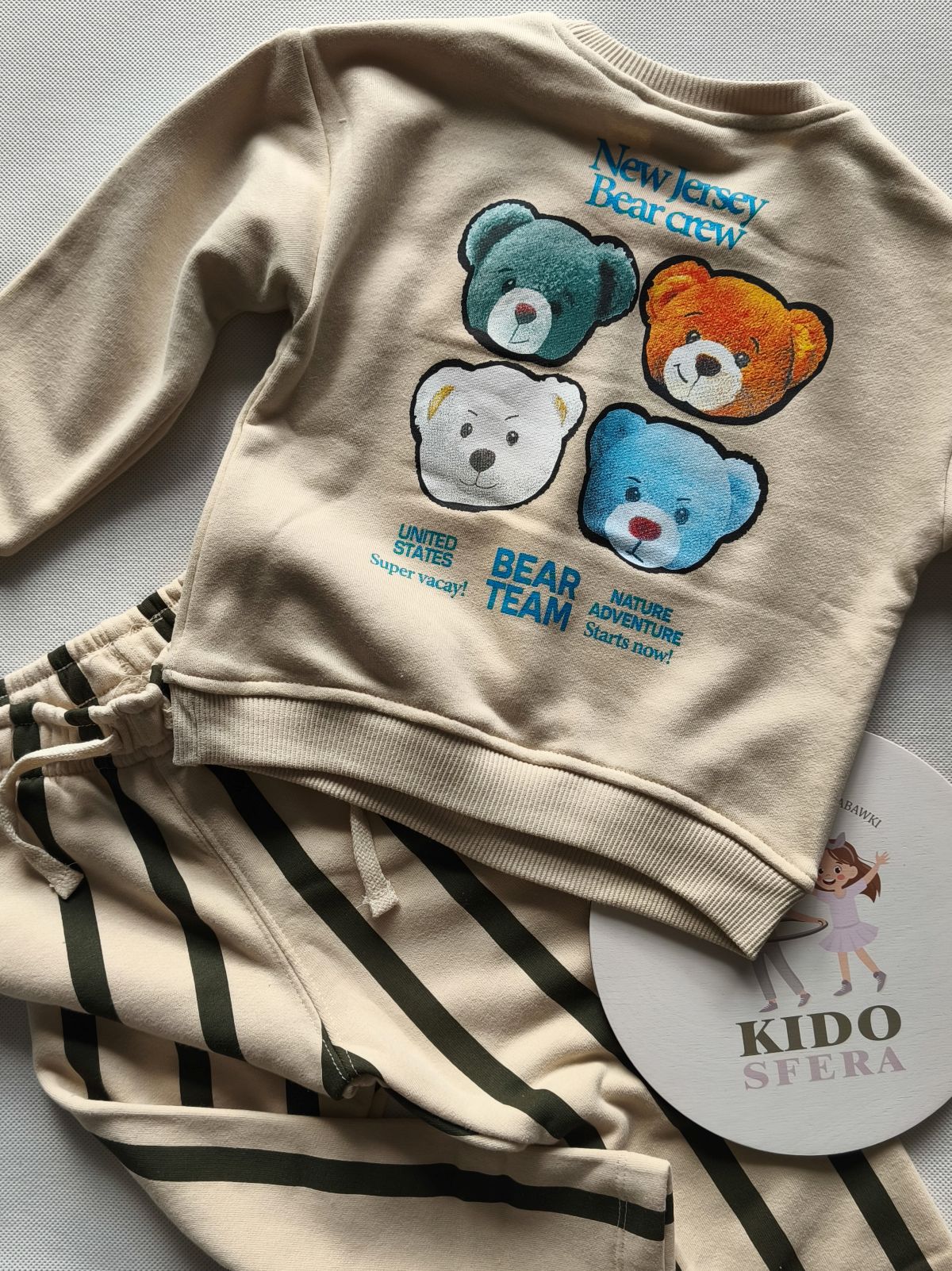 Jasnobeżowy🤍 dres dla chłopca: bluza z nadrukiem misiów + spodnie w pasy.🐻🐻❄️