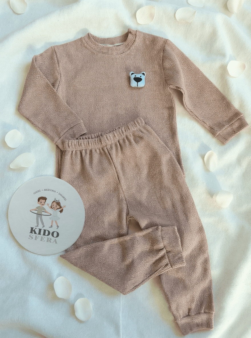 Komplet dla chłopca w jasnym brązowym kolorze, wykonany z tkaniny o wafelkowej strukturze 🧸🤎