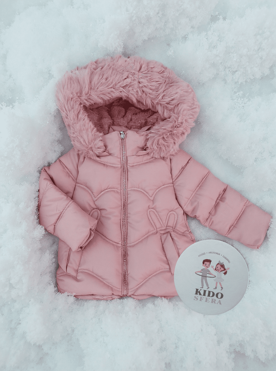 🎀 Kurtka zimowa ocieplana dla dziewczynki – pudrowy róż + torebeczka króliczek